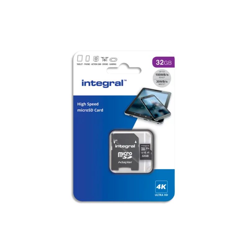 •  INTEGRAL Carte Micro SDHC+adaptateur 32Go V30 U3 A1 Class 10 UHS-I 100MB/s