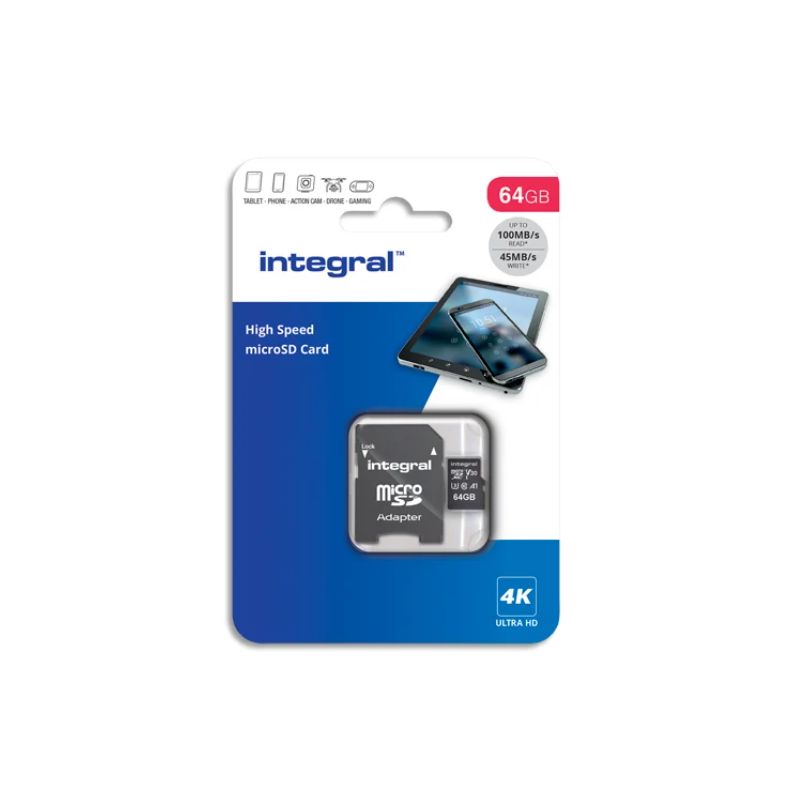 • INTEGRAL Carte Micro SDXC+adaptateur 64Go V30 U3 A1 Class 10 UHS-I 100MB/s