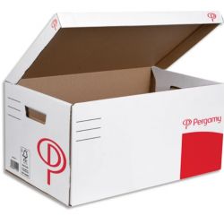 PERGAMY Boîte archive dos 20 cm. Montage manuel. Kraft ondulé. Blanc imprimé rouge